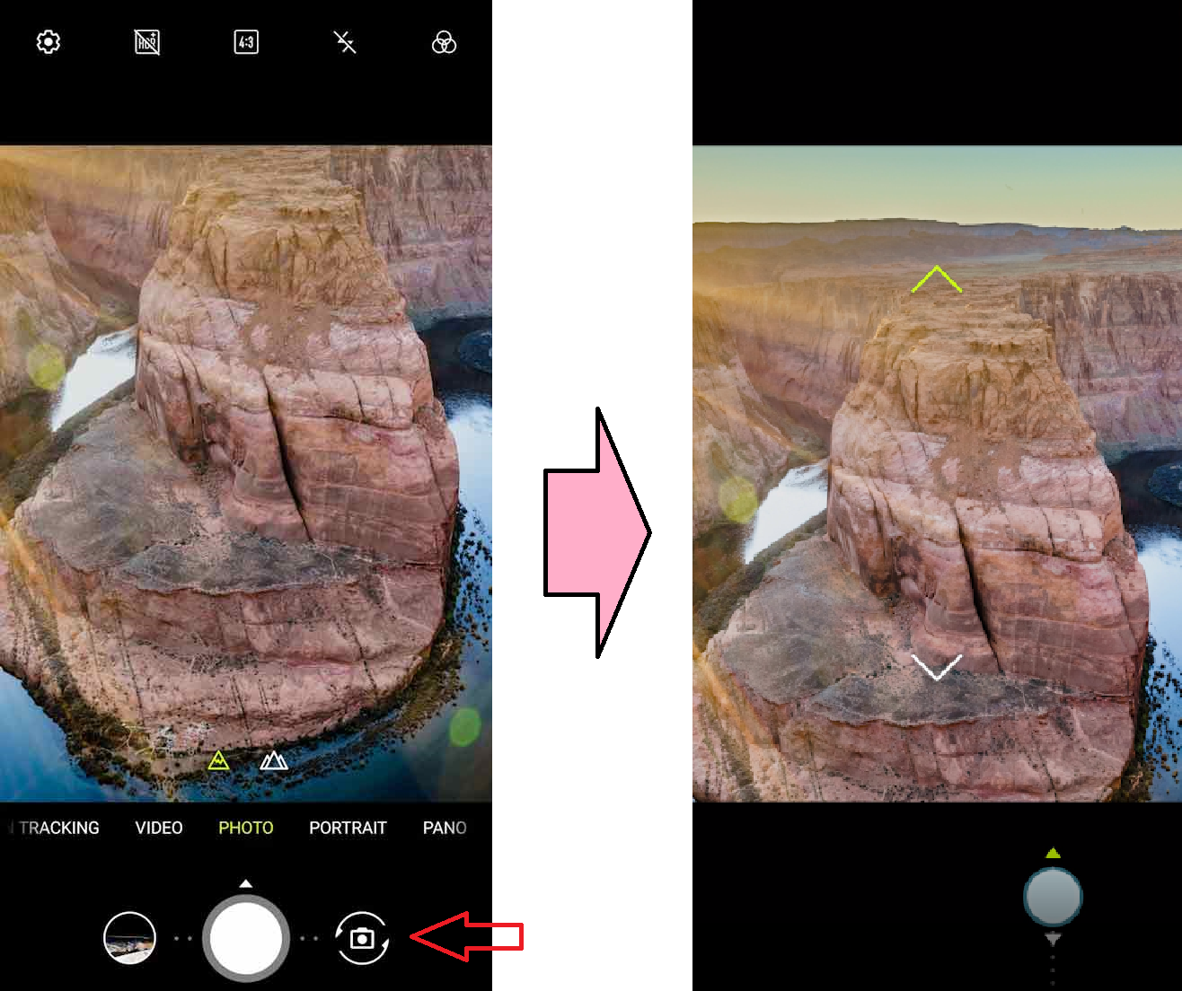 フリップカメラの操作方法ですが、画面内のシャッターボタンの右側のボタンを押しながら上下に指を動かすと、あわせてフリップ機構も動く仕掛けになっています。ちょっと分かりづらい気もしますが、それ目当てで買う人も多いと思うので、問題はないでしょう。